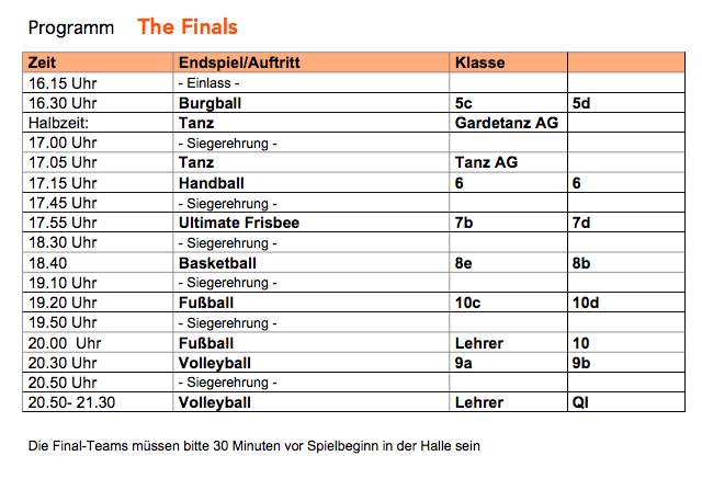 Am Abend des 17. März findet im Rahmen des 10-jährigen Schuljubiläums in diesem Jahr erstmals der "Finals Day" in der Sporthalle statt. Bei diesem Sportevent treten Schülerinennen und Schüler in verschiedenen Sportarten zu den abschließenden Finals der Klassenturniere an, die in den verschiedenen Jahrgängen ausgetragen werden.