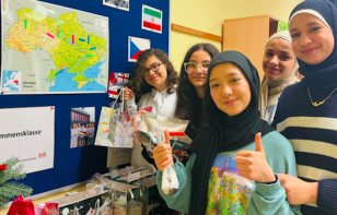 „Wir wollen gerne anderen Kindern etwas Gutes im Vorfeld des Weihnachtsfestes tun“, so die Überlegungen der Schülerinnen und Schüler der Willkommensklasse. Deshalb wurden reichlich Weihnachtstüten mit kleinen Geschenken befüllt und liebevolle Weihnachtskarten gestaltet, die dann an die Leitung des Hauses Heisterbach übergeben wurden.