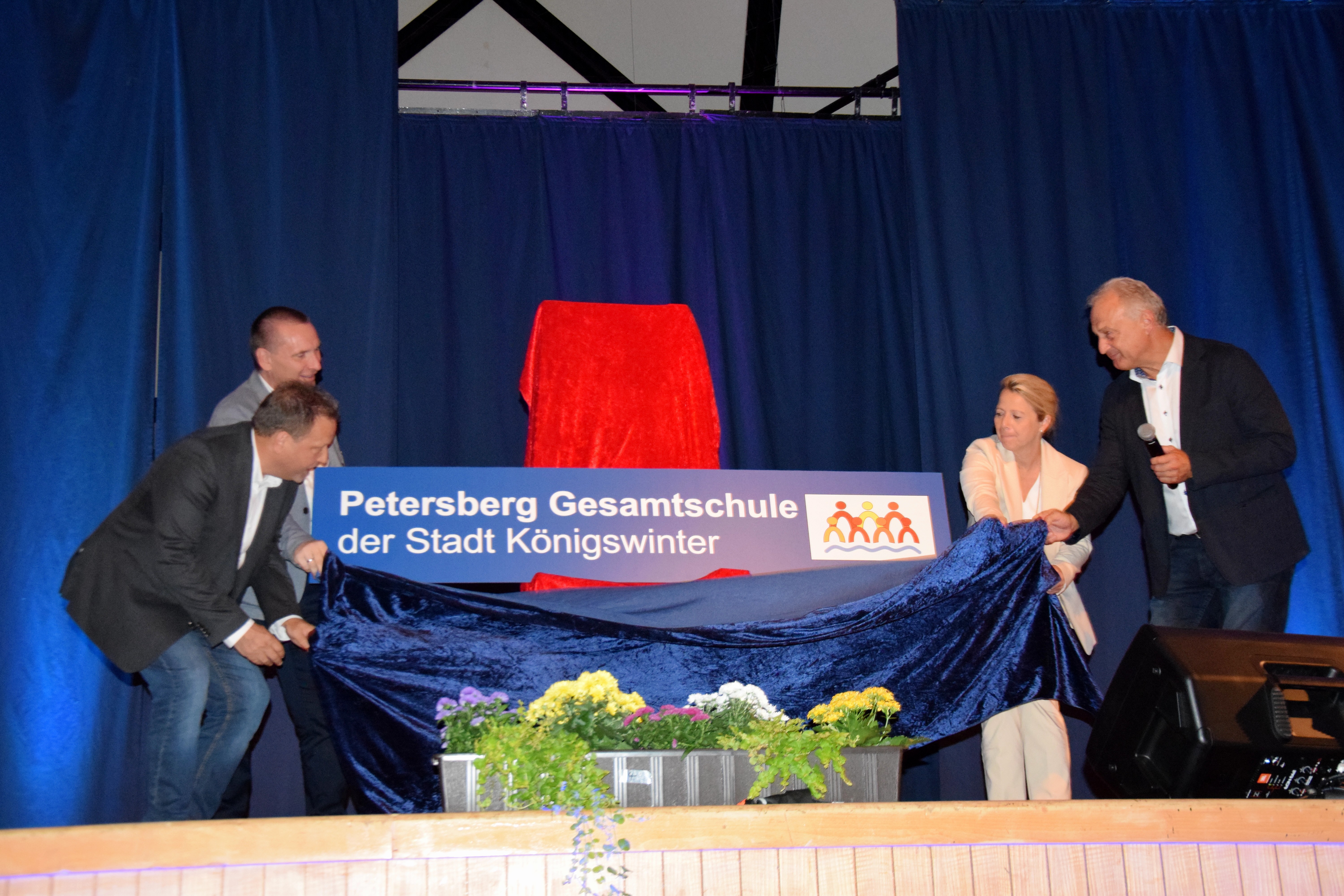 Am 5. September fand die Feierstunde zur Umbenennung der Gesamtschule Oberpleis in die "Petersberg Gesamtschule der Stadt Königswinter" statt. In festlichen Rahmen übergaben Bürgermeister Wagner und Schuldezernentin Jüngling als Höhepunkt der Feierlichkeiten zum 10jährigen Jubliäum das neue Eingangsschild an die Schulleitung.