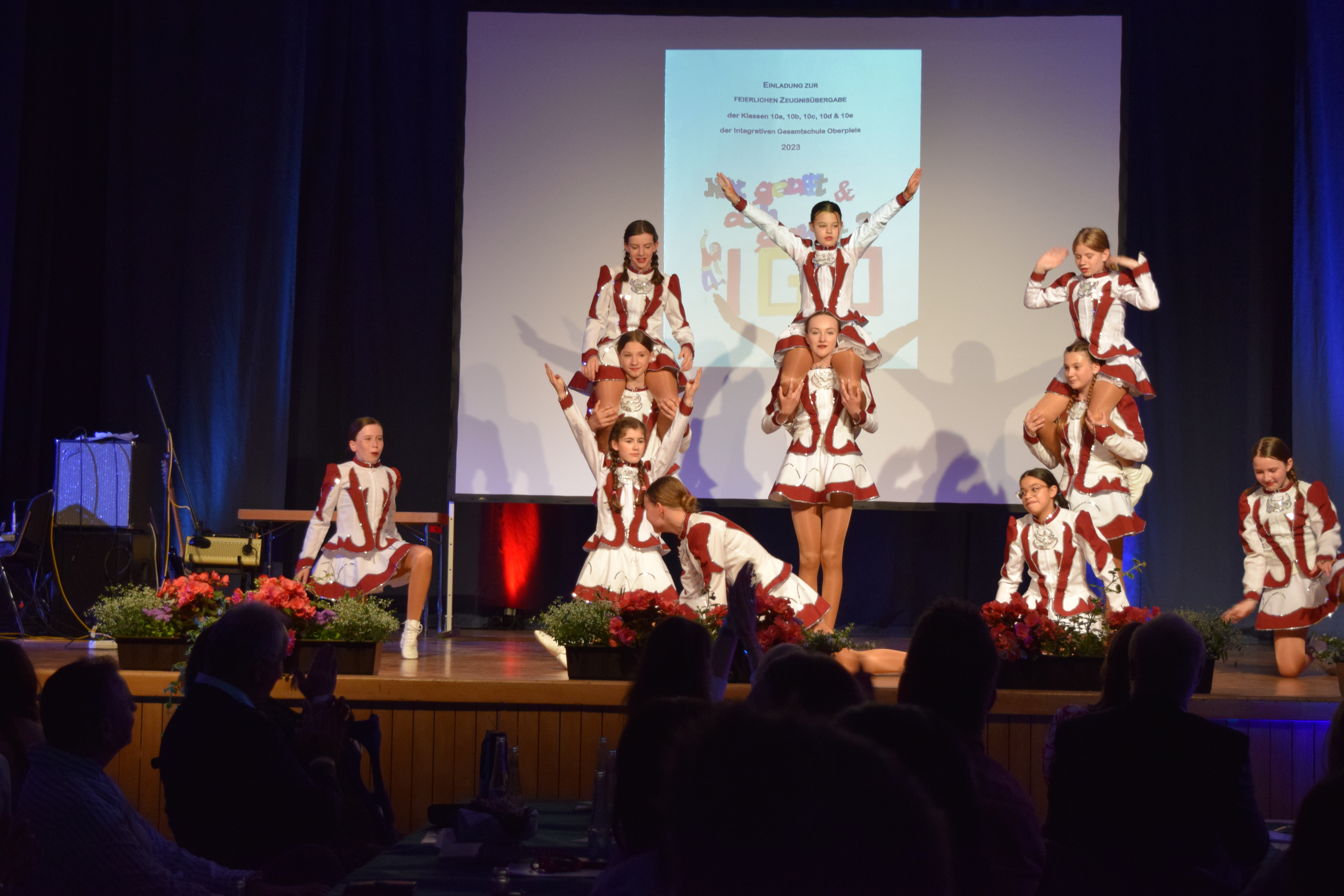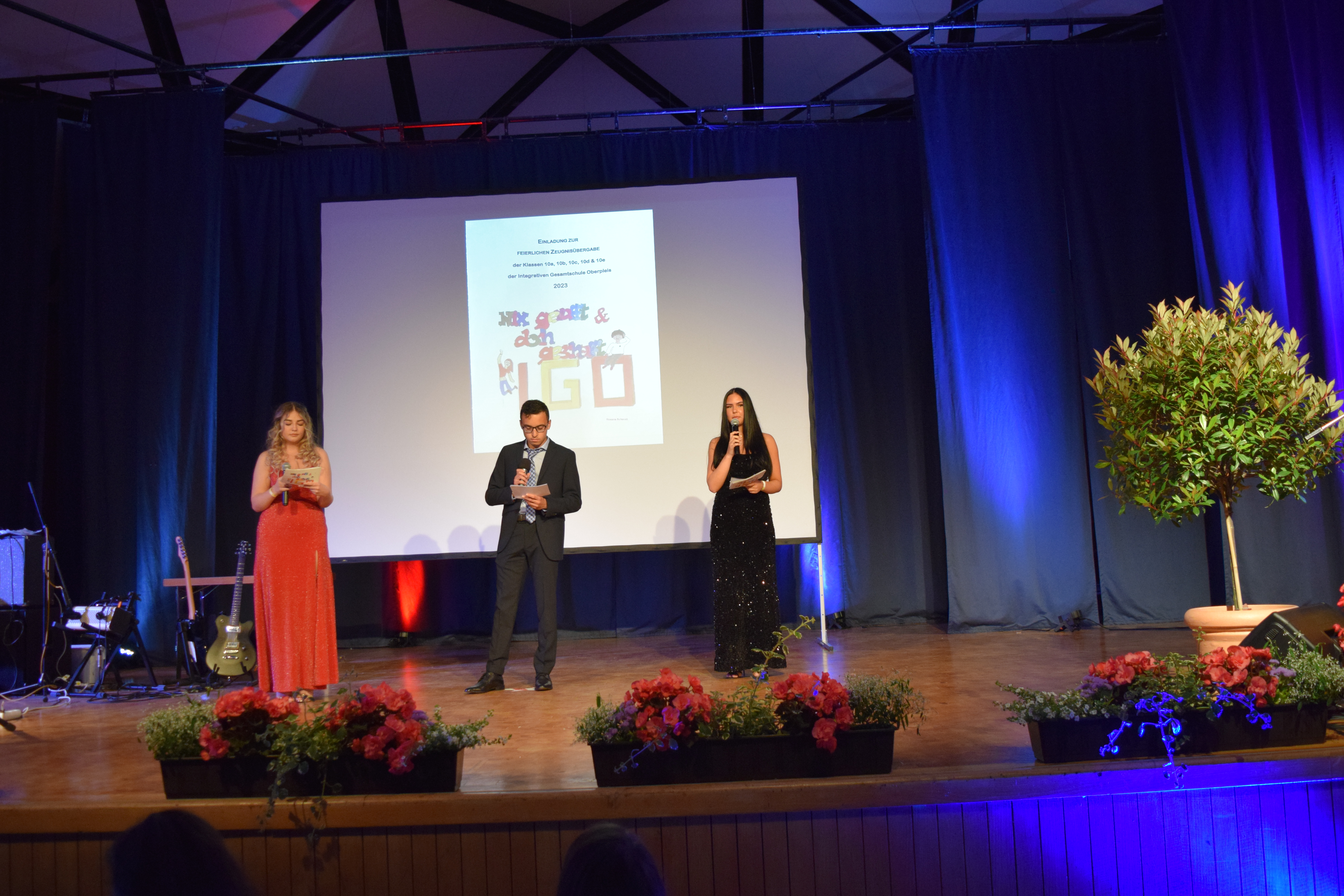 Die Gesamtschule Oberpleis konnte am Dienstag, 6. Juni, 123 Schülerinnen und Schülern Ihre Abschlusszeugnisse des 10.Jahrgangs überreichen. Besonders betont wurden in den Reden von Schulleiter Mai und der Schuldezernentin der Stadt Königswinter, Frau Jüngling, das besondere Engagement der Schule in der Berufsorientierung. Dies könne man daran sehen, wie vielfältig die Berufe seien, in die die Absolventen nun streben. Herausragend aber das Ergebnis der Abschlüsse: 57 Schülerinnen und Schüler bleiben der Schule in der Sekundarstufe II erhalten, da sie die Fachoberschulreife mit Qualifikationerreichten , die zum Besuch der Gymnasialen Oberstufe berechtigt. Jahrgangsbeste waren Beatriz Saraiva Cardoso(10a), Anna Jensen (10b) und Aziz Gienau (10d) mit einem Notenschnitt von jeweils 1,2. Die Gesamtschule Oberpleis wünscht allen Absolventen des 10. Jahrgangs alles Gute und viel Erfolg für den zukünftigen Lebensweg!