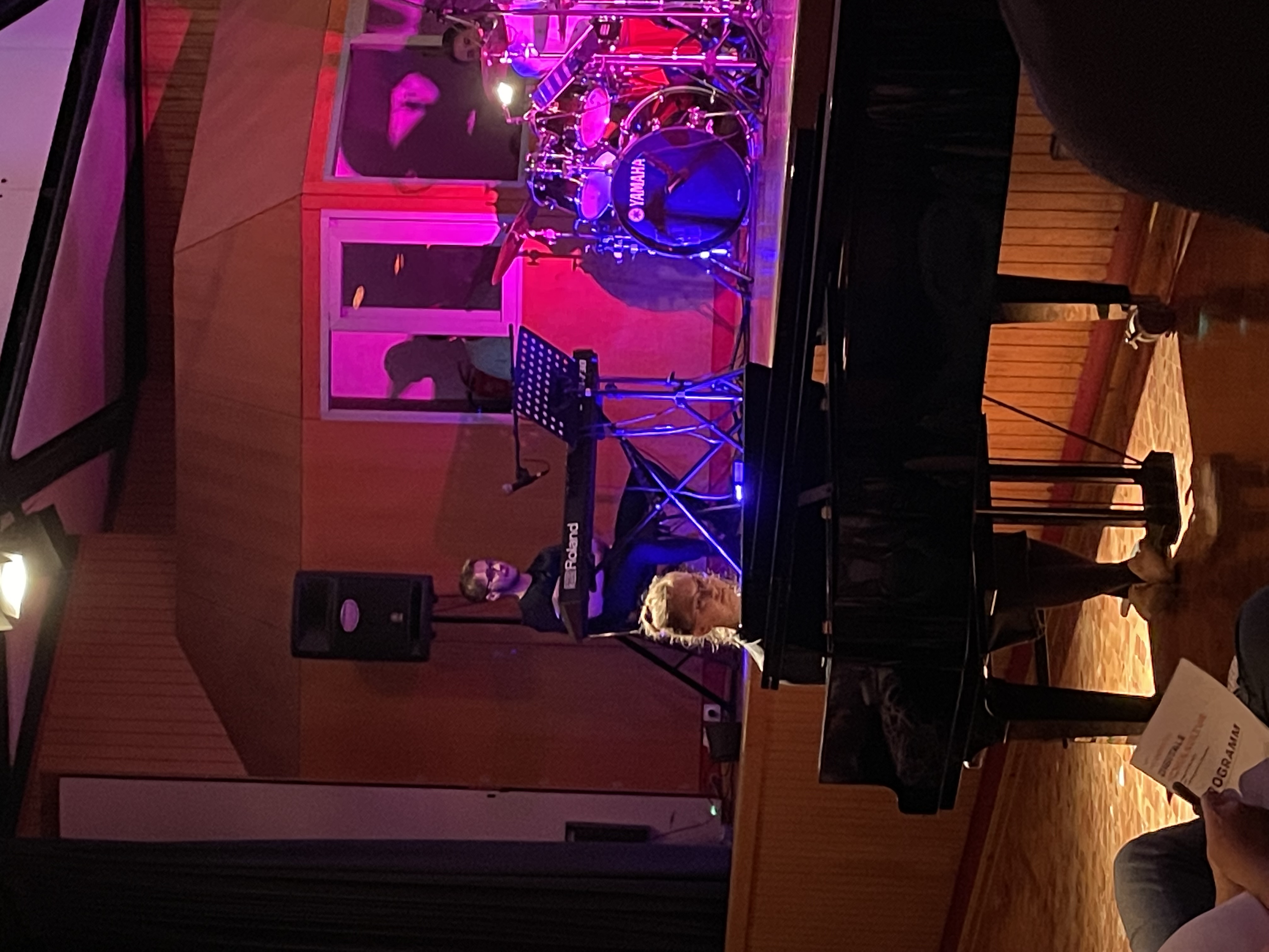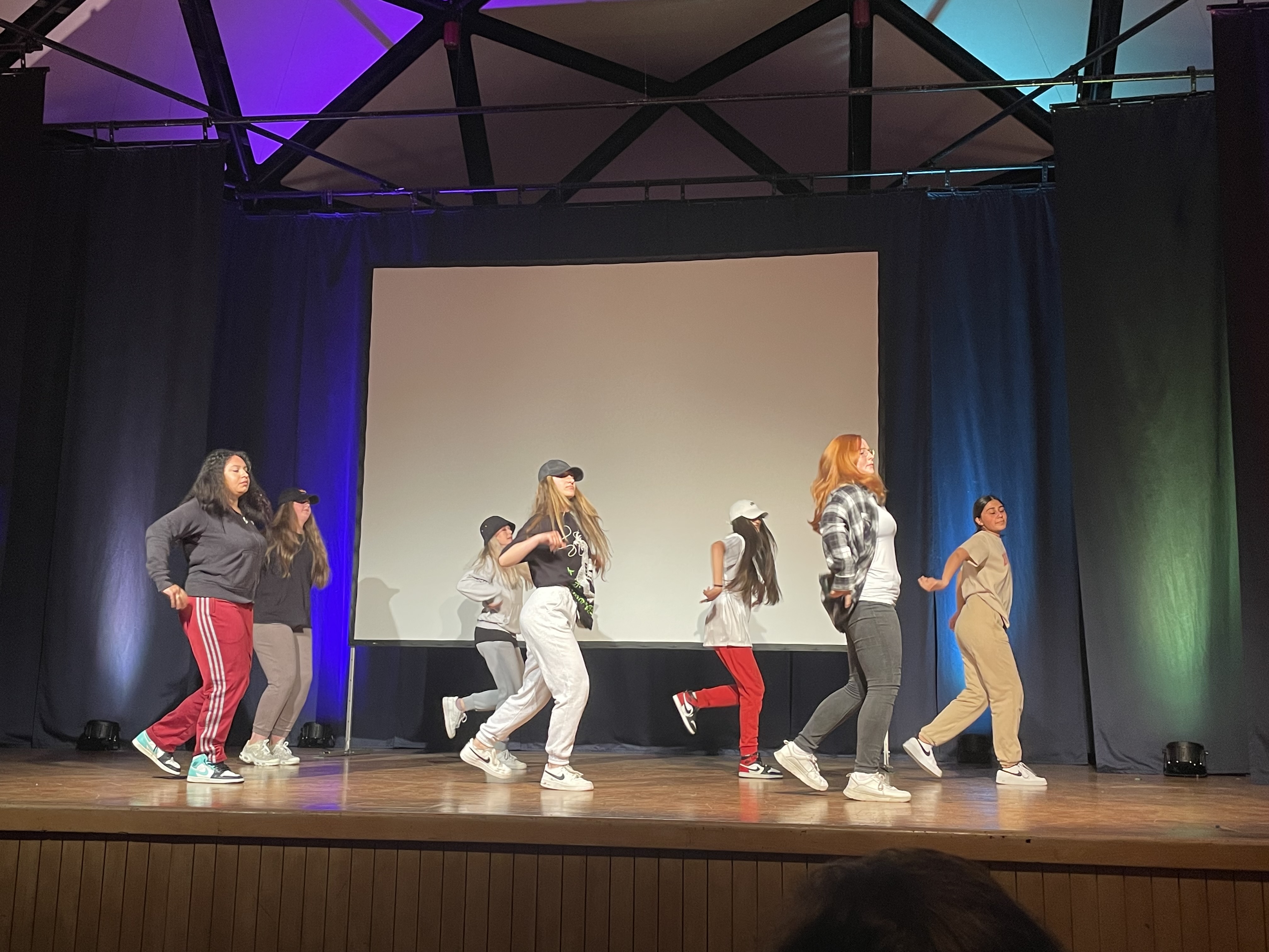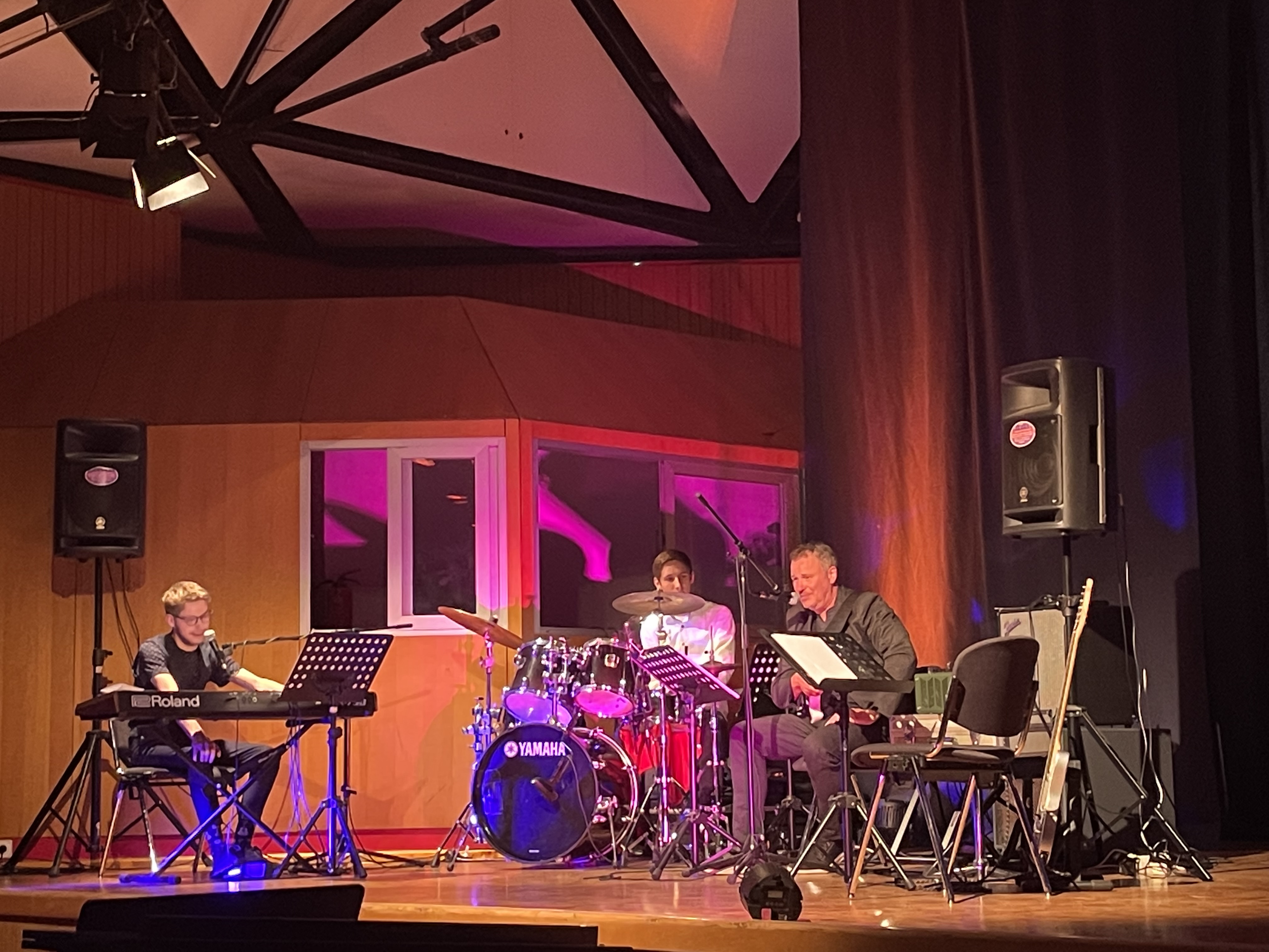Eingerahmt wurden die Filmprodukte von einem abwechslungsreichen Musik- und Bühnenprogramm, das von den Schülerinnen und Schülern des Kurses „Darstellen und Gestalten“ des 10. Jahrgangs unter der Leitung von Frau Flory-Vetter und der Schulband der Gesamtschule Oberpleis gestaltet wurde. Dabei wurde die Maskenperformance „Gleis 1“ aufgeführt, die wortlos und mit der starren Mimik der selbst entworfenen Masken Alltagssituationen auf einem Bahnsteig in Szene setzte. Die Schulband unter der Leitung von Manfred Hupperich performte zudem zum ersten Mal den Song live vor Publikum, mit dem sie beim Wettbewerb „Go ahead“ des Schulministeriums NRW den ersten Platz erreicht hat. Auch ansonsten setzte die Band mit ihrem Repertoire einige stimmungsvolle Highlights des Abends.
