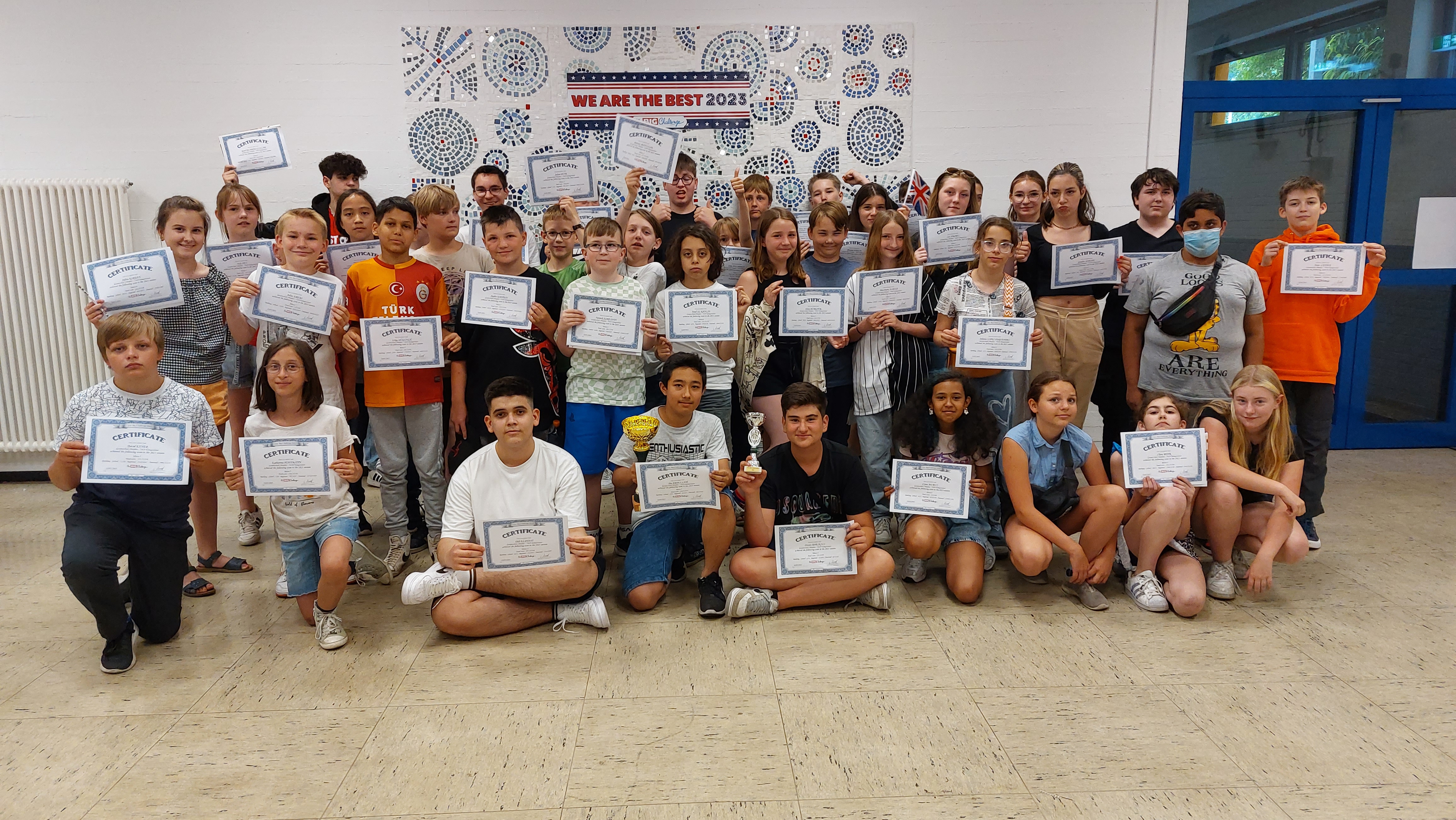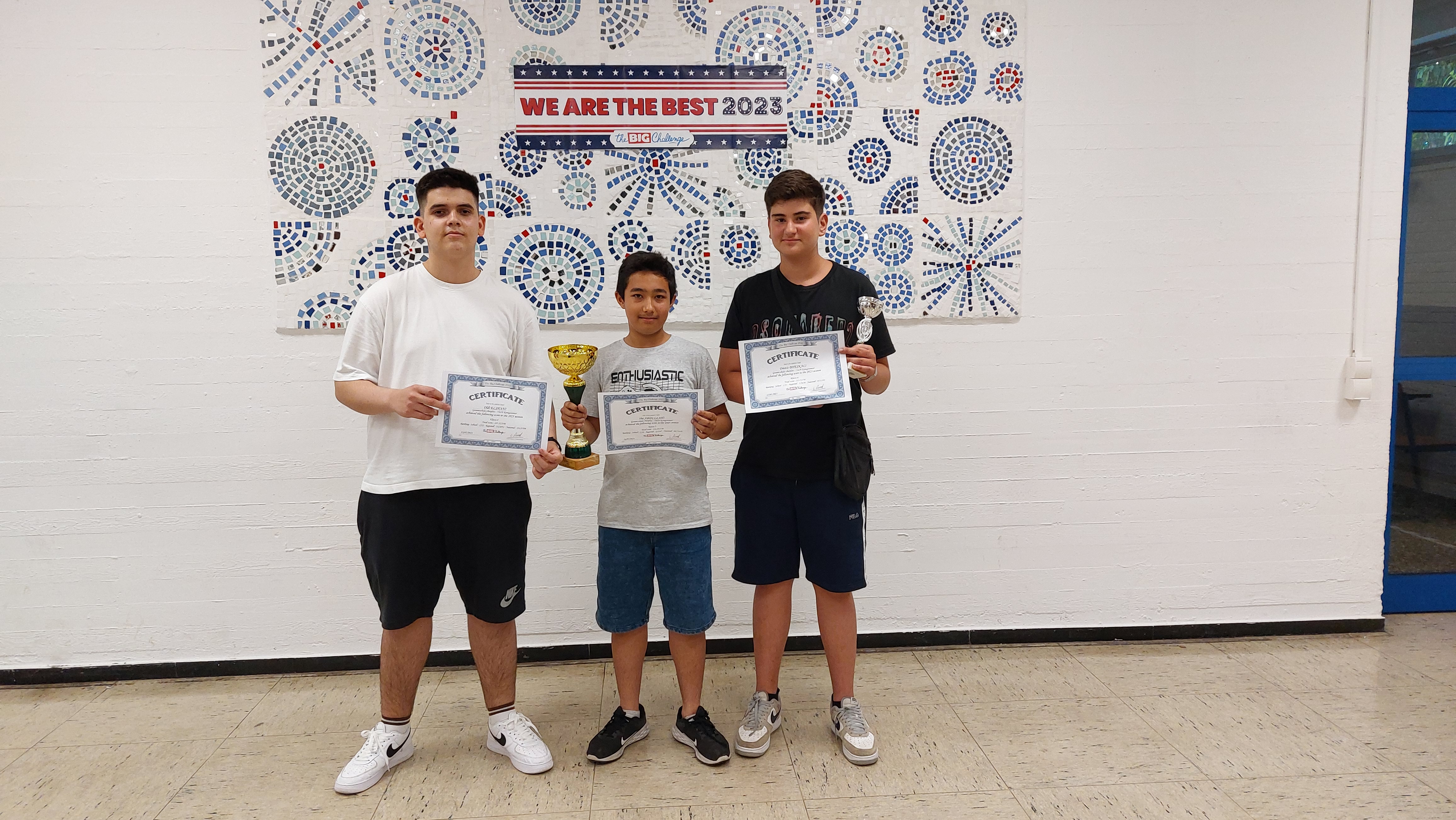 Auch in diesem Jahr waren die Ergebnisse unserer Schüerinnen und Schüler beim europaweiten Englisch-Wettbewerb "Big Challenge" sehr beeindruckend. Besondere Auszeichnungen erhielten Orestis Dheskali (Klasse 6) für seinen 6. Platz bundesweit unter mehr als 11.000 Teilnehmern, Ilia Abdullahi (Klasse 5) als Gesamtzweiter in NRW unter mehr als 4.200 Teilnehmern und Oldi Elshani (Klasse 8) als 33. in NRW (bei 3.500 Teilnehmern).