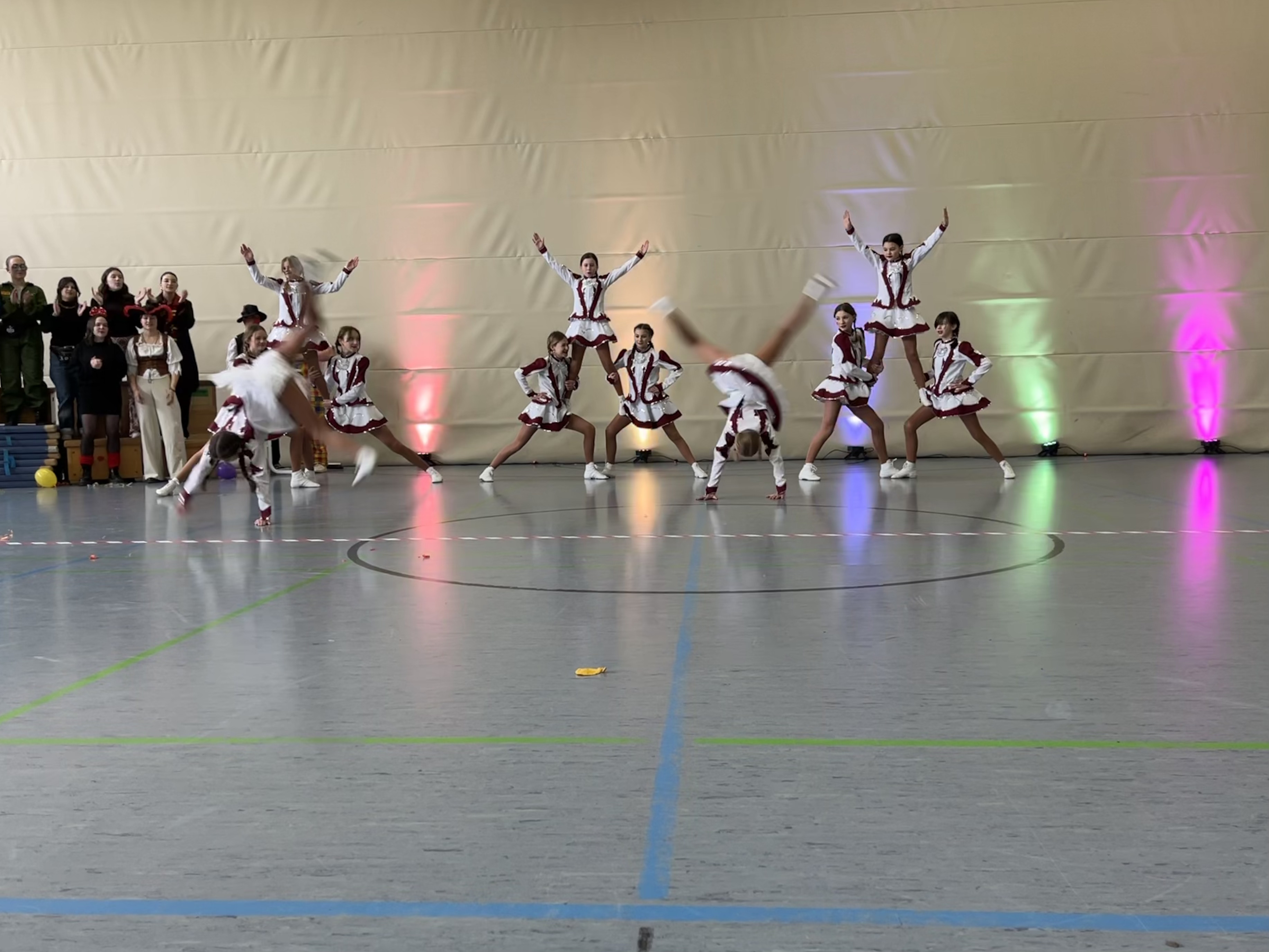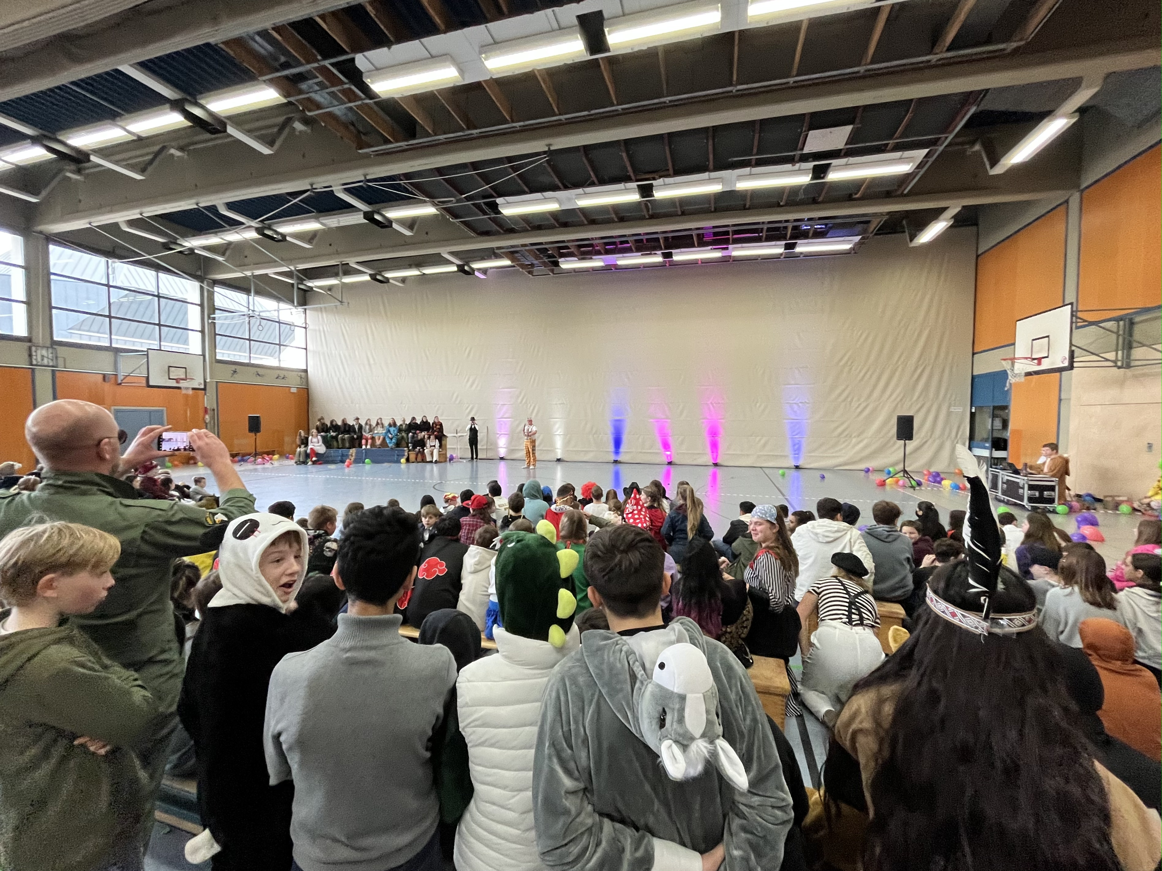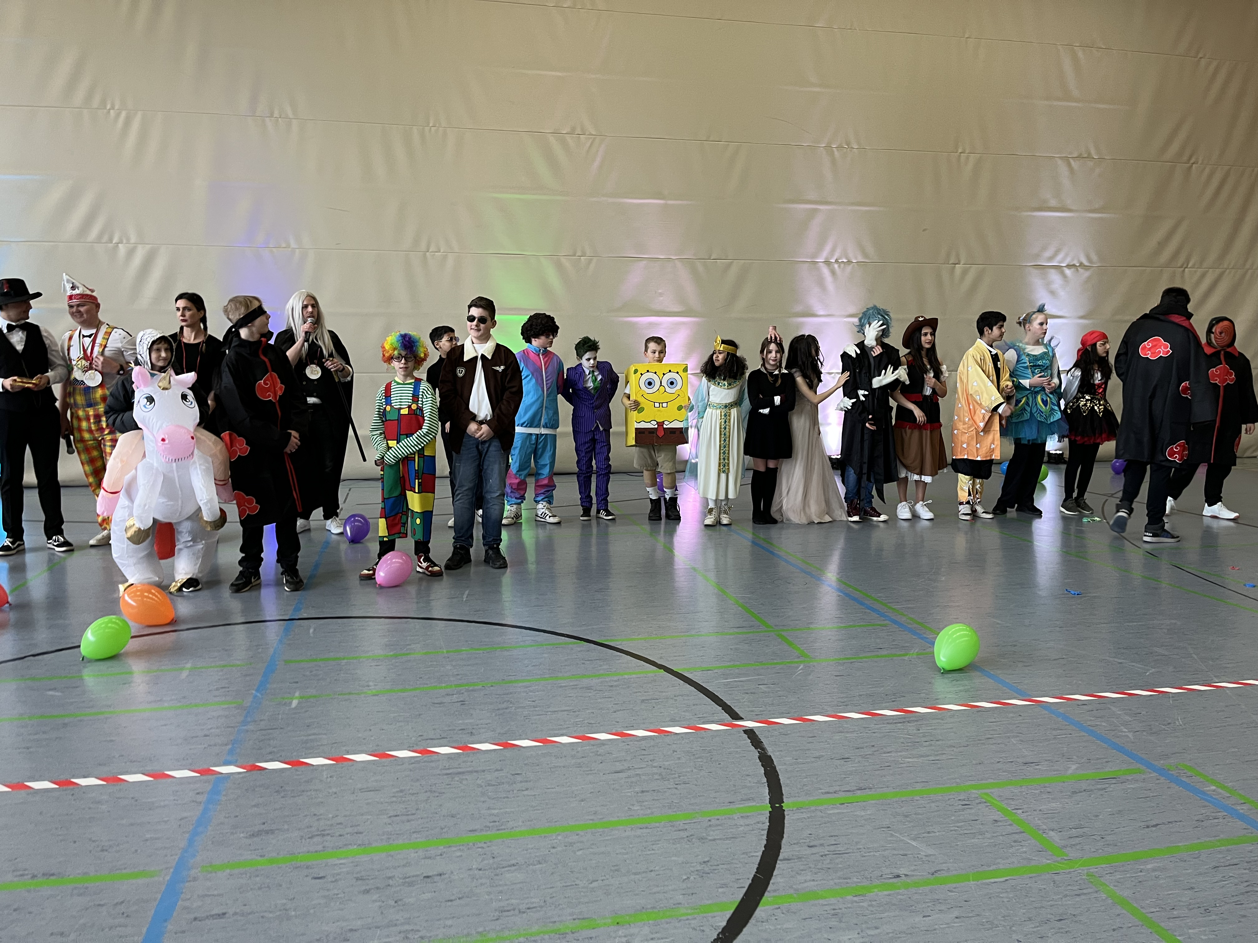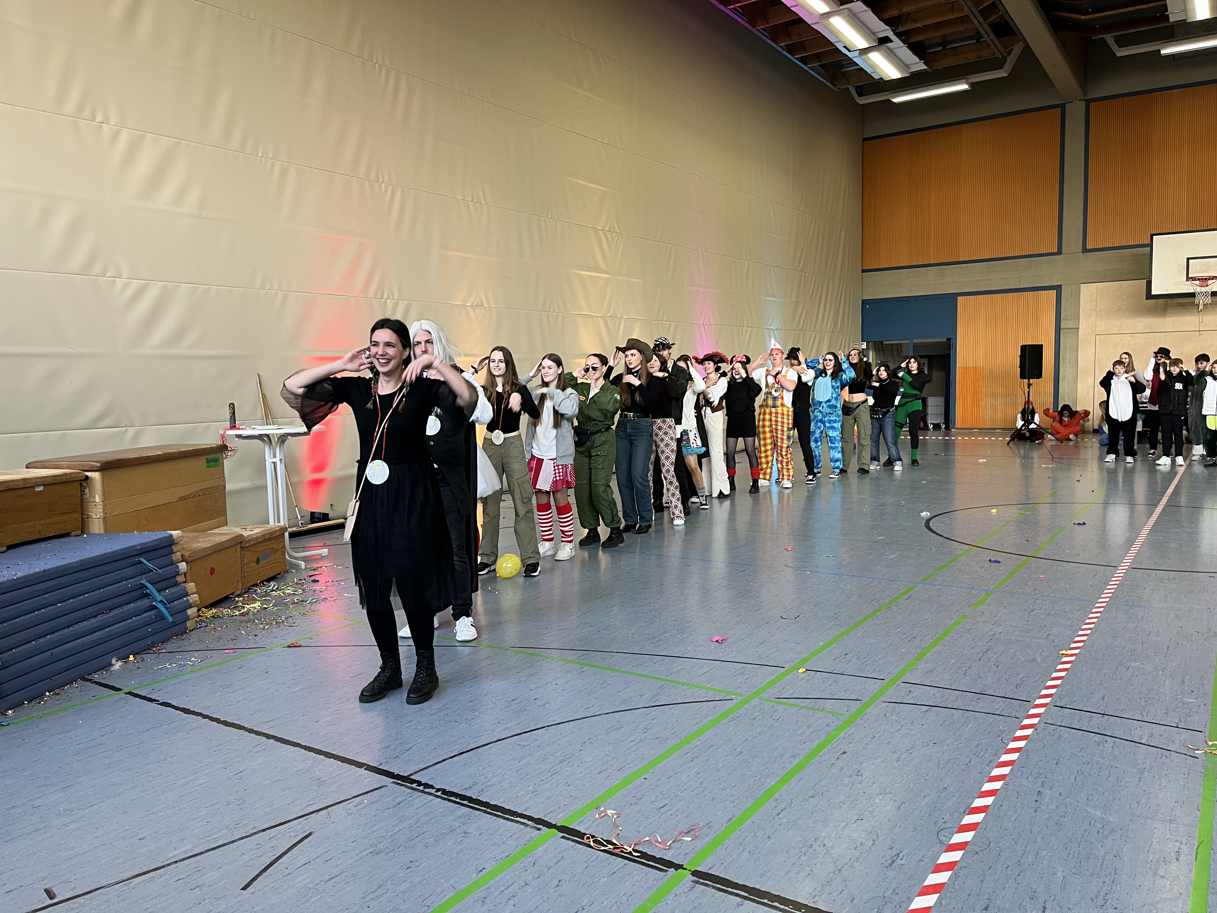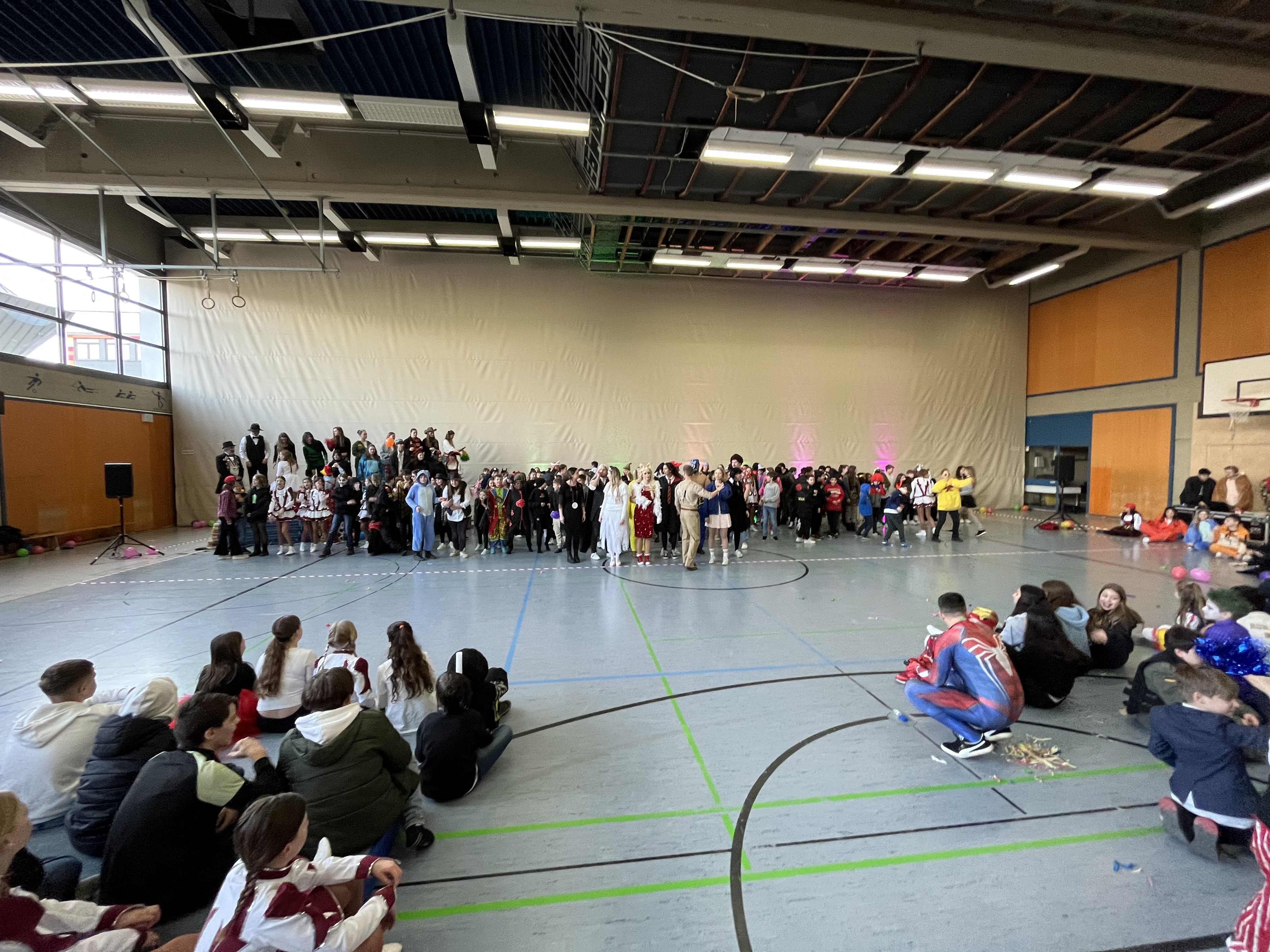 Die Schülerinnen und Schüler der 5. bis 7. Klasse feierten an Weiberfastnacht in der Sporthalle eine bunte Karnevalsfeier mit vielen närrischen Programmpunkten. Besondere Highlights waren wieder einmal das Lehrerballett und die Gardetanz-AG.