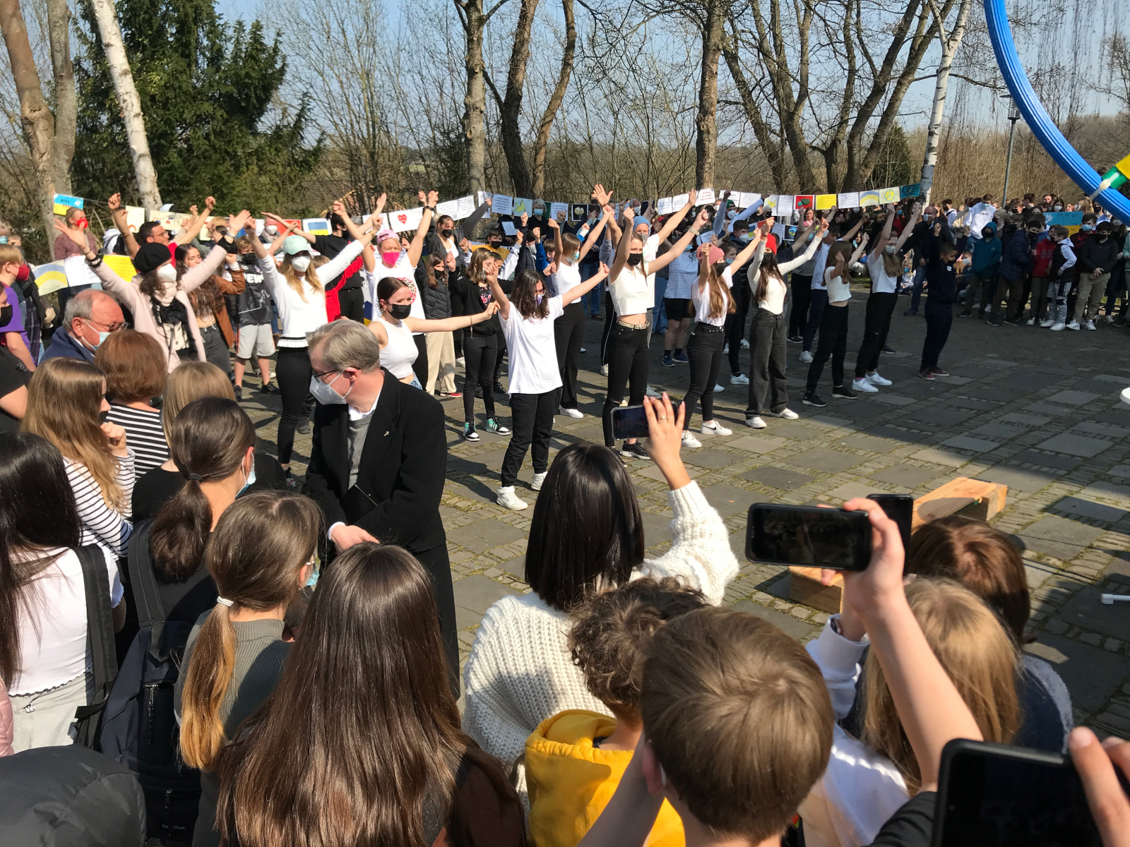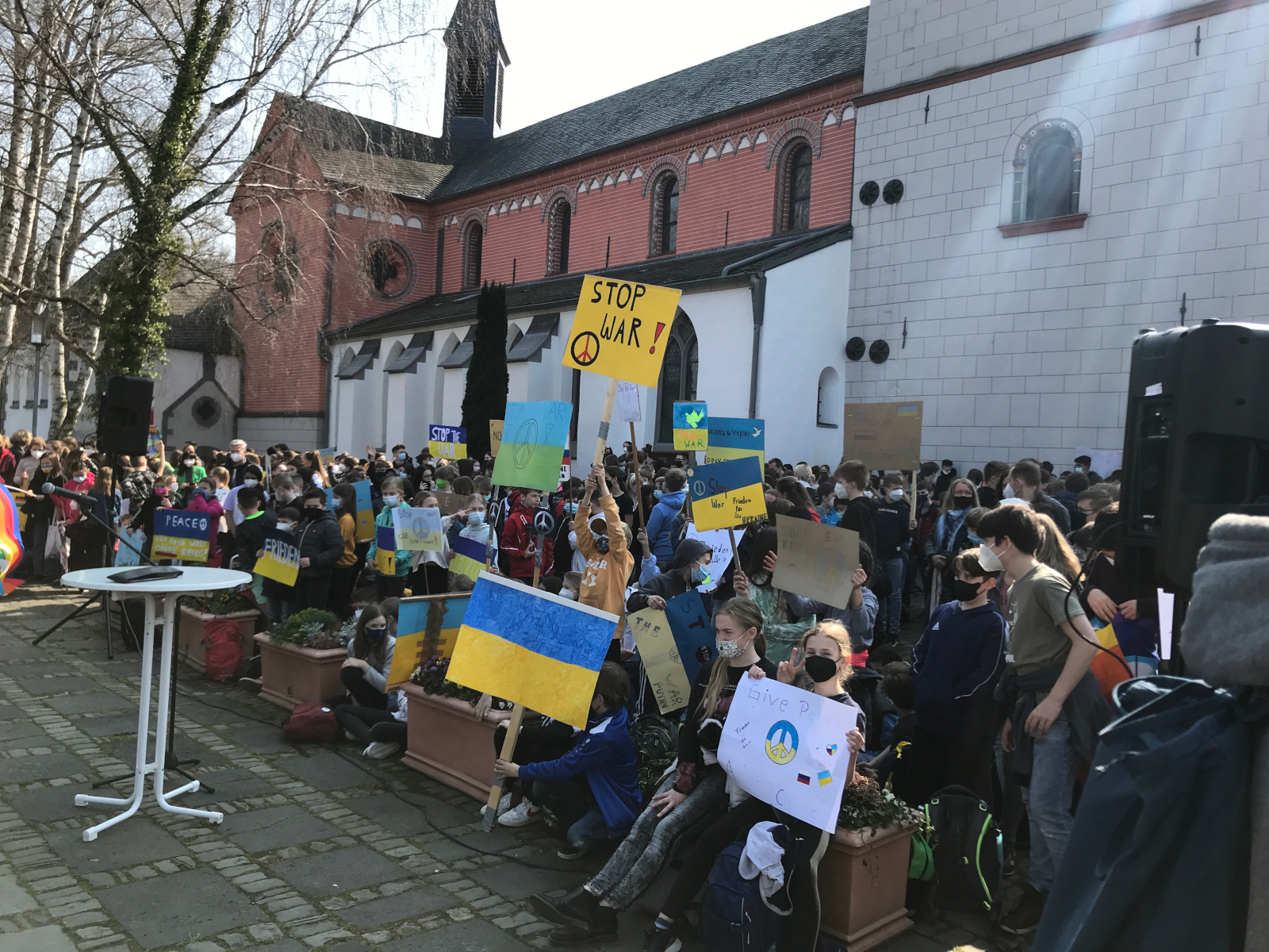 Gemeinsam mit den Religionsgemeinsschaften, Parteien und Vereinen organisierten die weiterführenden Schulen aus Oberpleis auf dem Kirchplatz von St. Pankratius eine stimmungsvolle Kundgebung für den Frieden. Mit bunten und aussagekräftigen selbstgestalteten Bannern, Schildern und Plakaten drückten die Schülerinnen und Schüler von Gesamtschule und Gymnasium gemeinsam ihren Forderungen nach einem sofortigen Ende des Krieges und ihre Solidarität für die Ukraine aus. Die SchülerInnenvertretung der Gesamtschule forderte die Menge zu einem Tanz-Flashmop auf den Song „Freedom“ auf. Besonders bewegend für die Teilnehmer war der Auftritt von Ludmilla Yudko, die selbst vor dem Krieg aus der Ukraine geflüchtet ist und in Oberpleis Aufnahme gefunden hat. Sie machte in ergreifenden Worten deutlich, wie wichtig es ist, sich für den Frieden zu engagieren und die Stimme gegen den Krieg zu erheben. Bürgermeister Wagner sprach von einer „wahnsinnig imposanten Kulisse“, von der eine klare Botschaft ausgehe: „Stoppt diesen Krieg!“